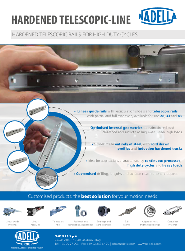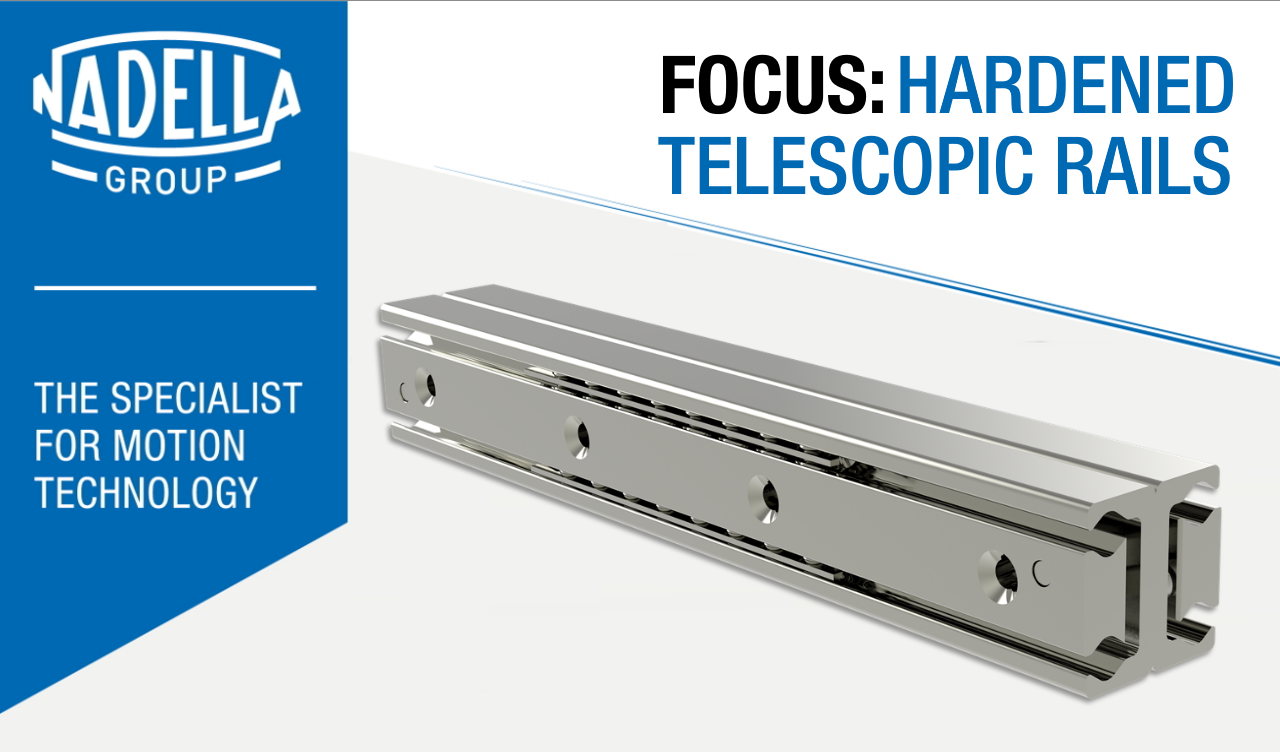 Les nouveaux rails télescopiques Nadella en acier trempé avec une capacité de charge élevée et une faible déflexion sont la solution idéale pour les applications nécessitant des cycles de service élevés et des processus continus. Améliorés avec des géométries internes optimisées pour un fonctionnement plus fluide et entièrement en acier, avec des profils étirés à froid et des chemins de roulement trempés par induction, ils sont conçus pour déplacer des charges lourdes sans compromettre leur roulement en douceur et leur jeu réduit. Actuellement disponible en trois tailles (28,33 et 43), la ligne télescopique durcie Nadella comprend :